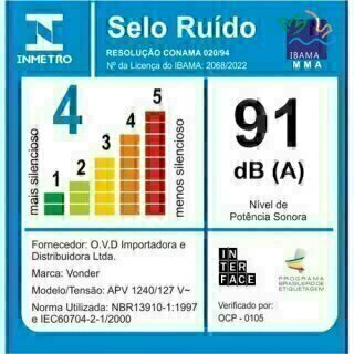 Produto com certificação Compulsória, conforme Portaria Inmetro n° 148 de 28/03/2022 e normas ABNT NBR NM 60335-1 e IEC 60335-2-69 com foco nos requisitos de segurança. Certificado por Organismo de Certificação de Produto acreditado pelo INMETRO.
