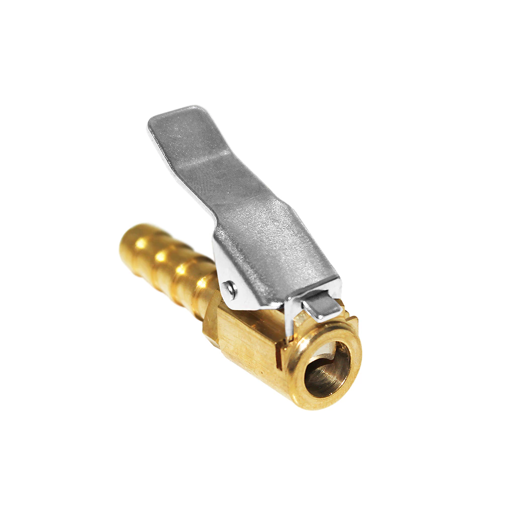 Fabricado com corpo inteiro em latão, oferece resistência, durabilidade e excelente vedação. Seu sistema de presilha garante fixação firme na válvula do pneu, evitando vazamentos e proporcionando eficiência no processo de calibragem.