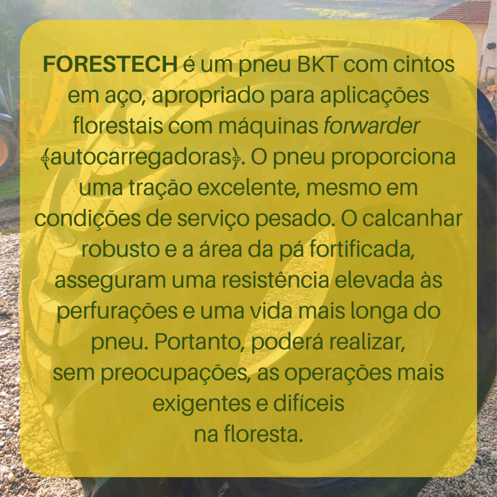 FORESTECH é um pneu BKT com cintos em aço, apropriado para aplicações florestais com máquinas forwarder (autocarregadoras). O pneu proporciona uma tração excelente, mesmo em condições de serviço pesado. O calcanhar robusto e a área da pá fortificada, asseguram uma resistência elevada às perfurações e uma vida mais longa do pneu. Portanto, poderá realizar, sem preocupações, as operações mais exigentes e difíceis na floresta.